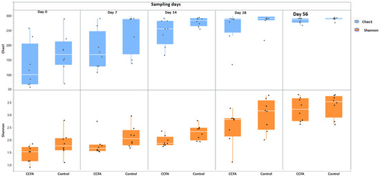 Alpha diversity of fecal microbiota in CCFA-treated and control lambs across sampling time points, assessed using Chao1 and Shannon indices. Both richness matrices increased significantly over time in both groups. However, the Shannon index showed reduced genus-level diversity in the CCFA group on days 7 and 14.