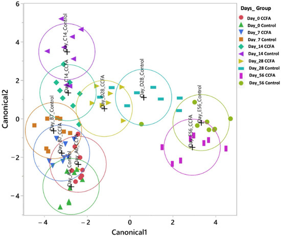 Canonical discriminant analysis of beta diversity in fecal microbiota across time in CCFA-treated and control lambs. A significant shift in beta diversity was observed over time, with distinct clustering between CCFA-treated and control groups at each time point.
