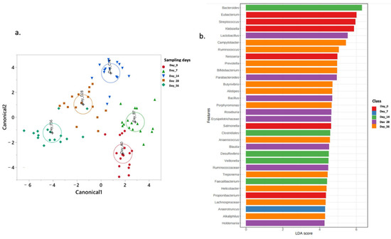(a) Canonical discriminant analysis (CDA) showing temporal clustering of genera in the control group from day 0 to day 56. (b) Linear discriminant analysis (LEfSe) of genera with > 0.25% mean relative abundance across time points, highlighting stage-specific microbial enrichment.