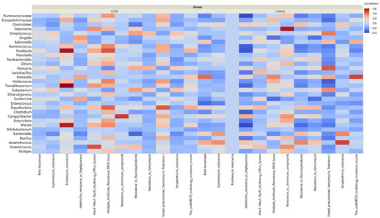 Correlation heatmap between enriched bacterial genera and predicted antimicrobial resistance genes (ARGs) in CCFA-treated and control lambs. The CCFA group showed stronger correlations between core taxa and ARGs.