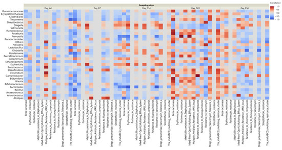 Correlation heatmap between enriched genera and functional ARGs in the CCFA-treated group across all sampling time points. Enrichment and correlation of resistance genes were most evident on day 28, particularly with beta-lactam and other multidrug resistance.