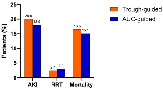 Comparison of primary and secondary outcomes between the AUC- and trough-guided cohorts (AKI—acute kidney injury; RRT—renal replacement therapy).
