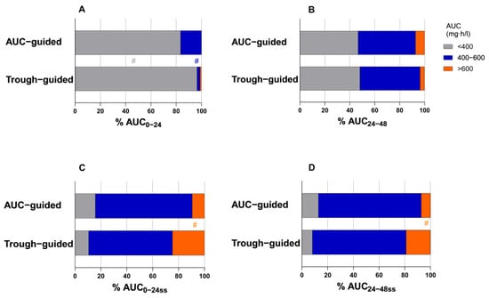 Distribution of AUC values categorized into subtherapeutic, target, and supratherapeutic ranges. Panels (A,B) represent AUC0–24 and AUC24–48 at the initiation of vancomycin therapy, while panels (C,D) illustrate AUC0–24ss and AUC24–48ss after reaching steady-state conditions. Data are stratified by monitoring strategy, comparing AUC- and trough-guided groups (# indicates that the difference between groups was statistically significant).