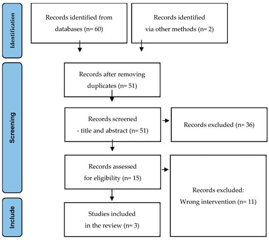A total of 62 references were identified from the search across six electronic databases. After removing duplicates, 51 unique studies remained. These were screened by title and abstract, excluding 36 studies that did not meet the eligibility criteria. Subsequently, 15 full-text studies were assessed for inclusion. Of these, ten studies were excluded due to inappropriate intervention types. Four studies were included in this review: three randomized controlled trials (RCTs), one pooled analysis of RCTs, and one expert consensus. The expert consensus was then excluded, as it did not provide any original evidence regarding the research question and included recommendations of one of the included clinical trials. These studies formed the basis for the qualitative synthesis of the results. The PRISMA flow diagram (Figure 1) summarizes the selection process, indicating the studies included and excluded at each step.