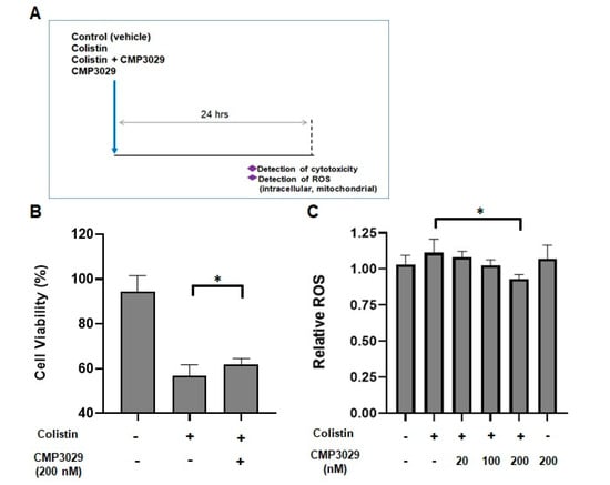2.2. CMP3029 Attenuated Colistin-Induced Intracellular and Mitochondrial ROS Overproduction of HK-2 Cells