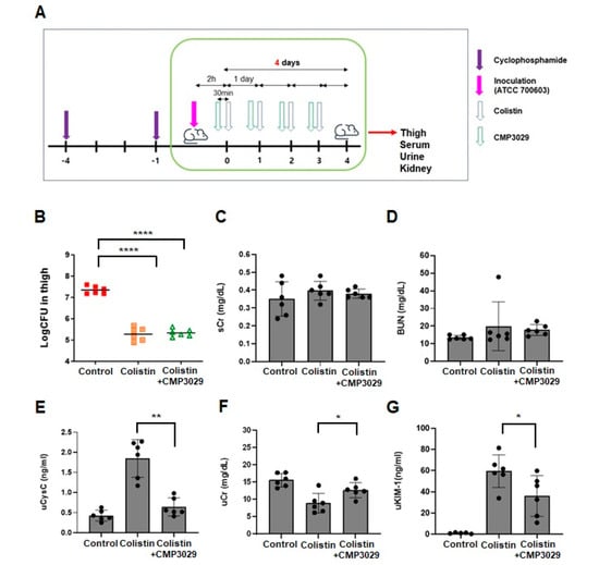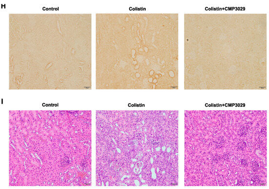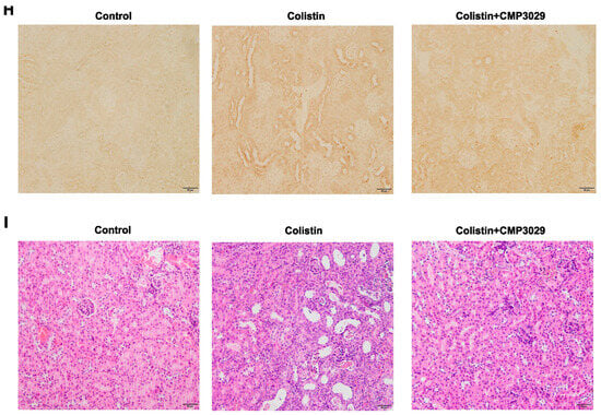 2.3. CMP3029 Mitigated Colistin-Induced Nephrotoxicity in an In Vivo Infection Model