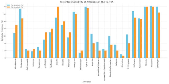 The complete antibiogram showed that several antibiotics were sensitive in the TSA and TKA/UKA groups. Both groups maintained full sensitivity to linezolid, teicoplanin, meropenem, rifampicin, and vancomycin. In the TSA revision group, full sensitivity was also observed for imipenem, tetracycline, tigecycline, amoxicillin/clavulanic acid, and cefuroxime. Additionally, in the TSA group, co-trimoxazole (17/18 strains, 94.4%) and fosfomycin (18/19 strains, 94.7%) exhibited high sensitivity rates. In the TKA/UKA group, co-trimoxazole (41/45 strains, 91.1%), tetracycline (49/53 strains, 92.5%), and tigecycline (54/55 strains, 98.2%) demonstrated high sensitivity rates. The sensitivity comparison between TSA and TKA/UKA is shown in Figure 2.