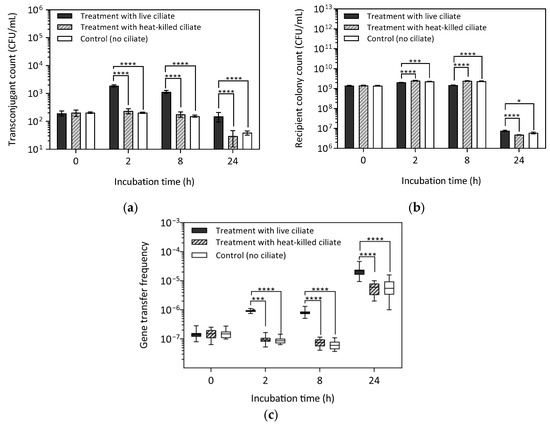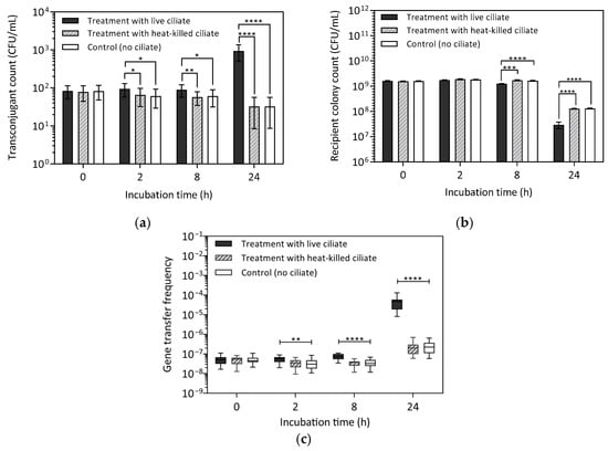 Conjugative vanA gene transfer between E. faecalis donor MF06036Van and recipient ST02103Rif harvested at 0, 2, 8, and 24 h with live and heat-killed ciliates. Data represent the standard error of the mean of 16 replicates. (a) Transconjugant count (b) Recipient colony count (c) Gene transfer frequency. The centre line in the box and whisker plot indicates the median transfer frequency. The box length represents the range of transfer frequency with the box edge at the 25th and 75th percentiles. Whiskers represent the minimum and maximum gene transfer frequency at each sampling interval. Asterisks indicate statistical significance: * p < 0.05, *** p < 0.001, **** p < 0.0001.