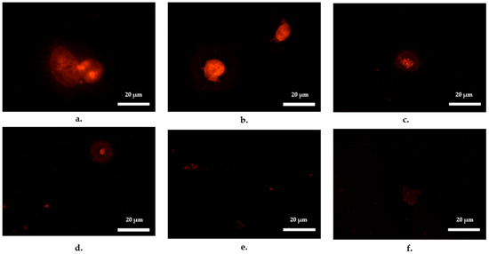 Images of fluorescence labelled Enterococcus faecalis inside Tetrahymena pyriformis after incubation periods of (a) 0.5 h (b) 1 h (c) 2 h (d) 4 h (e) 8 h and (f) 24 h in Page’s amoeba saline solution—ciliate vesicles with fluorescent E. faecalis are shown in the background (d–e). 109 CFU/mL E. faecalis was incubated with 105 N/mL T. pyriformis at 30 °C for 24 h. Fluorescence was viewed with a green excitation filter set at excitation/emission wavelength of 577/602 nm.