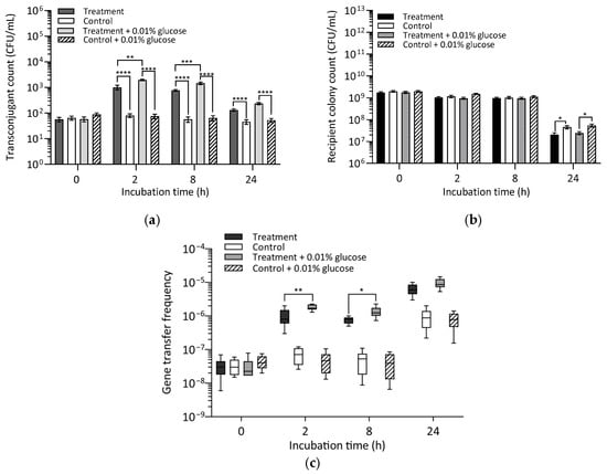 Effect of glucose availability on conjugative vanA gene transfer between E. faecalis donor MF06036Van and recipient ST02103Rif at 0 h, 2 h, 8 h and 24 h post incubation. Data represent the standard error of the mean of nine replicates. (a) Transconjugant count. (b) Recipient colony count. (c) Gene transfer frequency. Asterisks indicate statistical significance: * p < 0.05, **p < 0.01, *** p < 0.001, **** p < 0.0001.