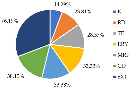 Among the antibiotics tested, trimethoprim-sulfamethoxazole exhibited the highest prevalence of resistance (76.19%), followed by meropenem (33.33%), tetracycline and erythromycin (28.57%), rifampicin (23.81%) and kanamycin (14.89%), as seen in Figure 1. Resistance to ampicillin, chloramphenicol, gentamicin, linezolid or vancomycin was not detected.