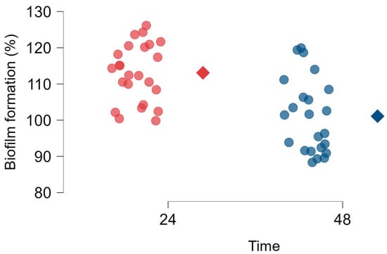 Biofilm formation capacity (expressed as % in comparison to the reference strain) of L. monocytogenes strains isolated from different meats products. Red and blue dots represent the mean biofilm biomass formed in independent tests of the individual isolates at 24 h and 48 h, respectively. The red and blue diamond shape symbols indicate the group average biofilm biomass at 24 h and 48 h, respectively. Statistical significance was determined using one-way ANOVA followed by Tukey’s multiple comparison test (p < 0.01).