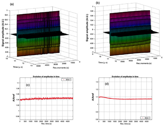 A superposition of the 1000 registered signals, recorded every 5 s using a digital oscilloscope, for the CrHApAPV and CrHApAPV-Ax samples is shown in Figure 1a,b. From right to left are all the signals covering the 5000 s of the process evolution. It can be observed that in the case of the CrHApAPV sample, the signals were not uniform, with temporary variations in the acoustic signal amplitudes, which are visible in the plot. For the CrHApAPV-Ax sample, the sedimentation process was very slow, with imperceptible variations in the acoustic signal amplitudes (Figure 1b). The evolution of the amplitudes over time is detailed in Figure 1c,d. A slow and continuous increase in amplitude was observed during the 5000 s monitoring period for the CrHApAPV sample (Figure 1c). It can be observed that the ultrasonic signal generally had an amplitude A/Aref > 1, which was attributed to the presence of nanoparticles with lower attenuation and a higher compressibility coefficient (Figure 1c). On the other hand, for the CrHApAPV-Ax sample, the sedimentation process was very slow, with imperceptible variations in the acoustic signal amplitudes in Figure 1d. It was observed that for the CrHApAPV-Ax sample, there was a slow increase in amplitude during the first 200 s, followed by a reduction in amplitude during the next 2000 s, and finally, a slow increase in the signal’s peak amplitude. It can be observed that the ultrasonic signal generally had an amplitude larger than in that of the reference fluid (A/Aref > 1), which was attributed to the presence of nanoparticles with low attenuation and a higher compressibility (Figure 1d).