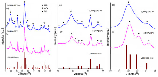 XRD patterns of CrHApAPV-Ax (a) and CrHApAPV (b) coatings in the 2θ range of 15° to 55°. XRD patterns of CrHApAPV-Ax (c) and CrHApAPV (d) coatings in the 2θ range of 15° to 30°. XRD patterns of CrHApAPV-Ax (e) and CrHApAPV (f) coatings in the 2θ range of 30° to 35°. XRD patterns of pure hexagonal hydroxyapatite JCPDS 09-0432 (burgundy columns).