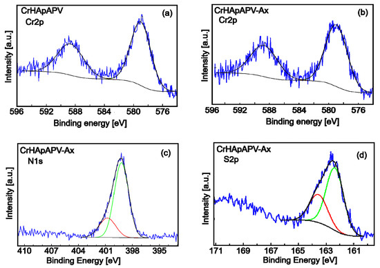 High-resolution XPS spectra of Cr 2p for CrHApAPV (a) and CrHApAPV-Ax (b) samples. High-resolution XPS spectra of N1s (c) and S 2p (d) for CrHApAPV-Ax samples.