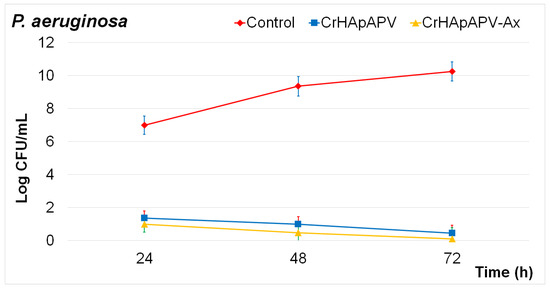 Graphical representation of the log colony-forming units (CFUs)/mL of Pseudomonas aeruginosa 27853 ATCC after incubation with the CrHApAPV and CrHApAPV-Ax coatings for 24, 48, and 72 h.