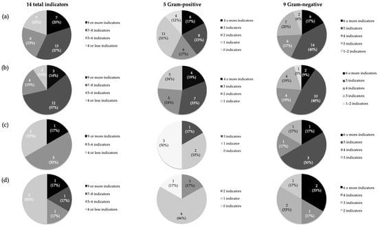 Figure 1. Distribution of the total 35 LAB isolates (a), 21 Lc. garvieae (b), 6 St. salivarius (c) and 6 E. avium (d) according to their direct antimicrobial activity against the 14 microorganisms used as indicators (5 Gram-positive and 9 Gram-negative) by a SOAT.