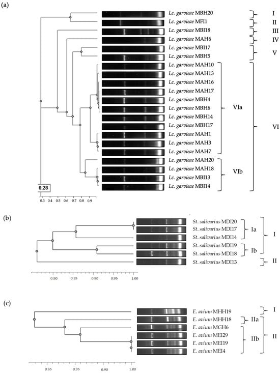 Phylogenetic relatedness of the 35 LAB was determined by ERIC-PCR (Figure 2). Lc. garvieae isolates presented a high phylogenetic diversity, showing six different clusters (I-VI). Lc. garvieae isolates were identified in three different hakes (hakes A, B and F). Specifically, isolates from hake A were grouped into two different clusters (IV and VI), and isolates from hake B into four clusters (I, III, V and VI). In the case of St. salivarius isolated from hake D, they were highly similar (76%), detecting two ERIC-PCR patterns: cluster I, divided into Ia and Ib, and cluster II. On the other hand, E. avium isolates were found in three different hakes (hakes E, G and H) and presented a high phylogenetic relationship (83%). These isolates were grouped in cluster I and II, the latter divided into IIa and IIb. Interestingly, two isolates (E. avium MH19 and E. avium MH18) belonging to hake H were grouped into two different clusters, namely I and IIa, respectively. In addition, cluster IIb included the E. avium isolates from hakes E and G.