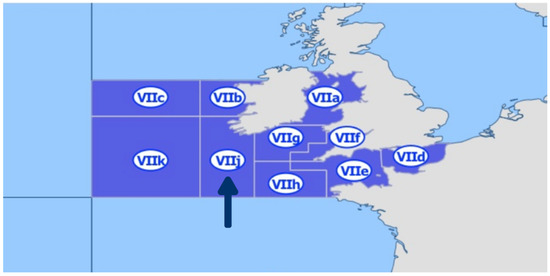 Figure 4. Map showing fishing area 27 (Atlantic, Northeast) according to the FAO, including the following divisions: VIIa (Irish Sea), VIIb (West of Ireland), VIIc (Porcupine Bank), VIId (Eastern English Channel), VIIe (Western English Channel), VIIf (Bristol Channel), VIIg (Celtic Sea North), VIIh (Celtic Sea South), VIIj (Southwest of Ireland/East) and VIIk (Southwest of Ireland—West). The arrow shows sub-area 27.VIIj where European hakes were caught. Source: https://fish-commercial-names.ec.europa.eu/fish-names/fishing-areas_en (accessed on 2 January 2025) [113].