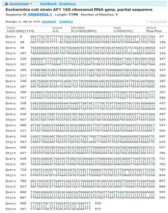 A comparison of sequences of the nitrogen base between the local isolate (Escherichia coli) and the standard strain (ON653022.1).