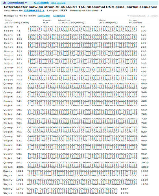A comparison of sequences of the nitrogen base between the local isolate (Enterobacter ludwigii) and the standard strain (OP986255.1).