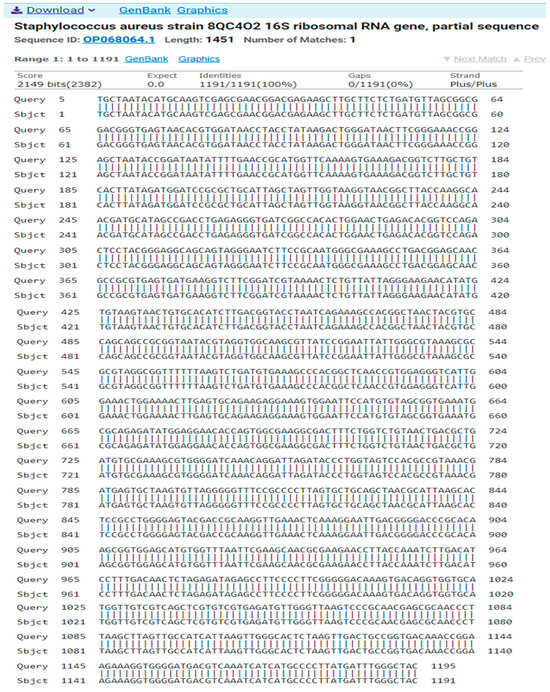 The result of the program DNA BLAST analysis showed a similarity of (100%) between sequences of bacterial isolates registered in the Gene Bank with the number OP068064.1 (Figure 8).