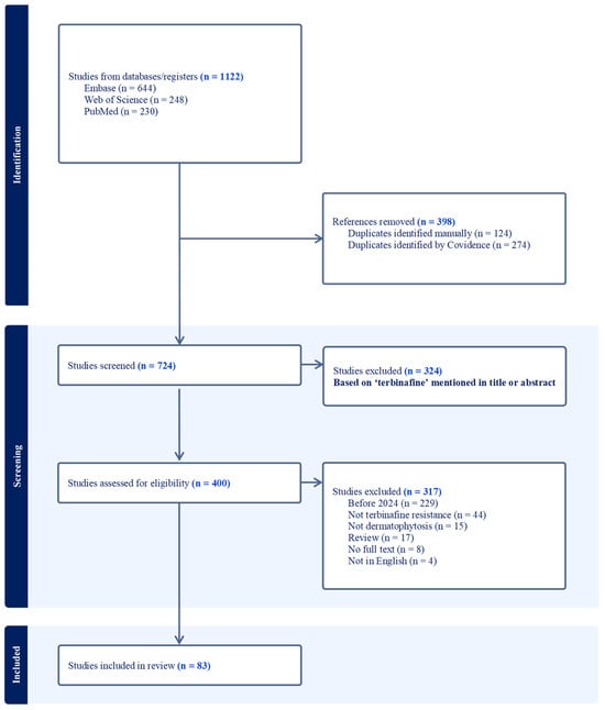 PRISMA flow diagram illustrating the selection process for studies included in the review. Literature searches were performed in PubMed, Embase (Ovid), and Web of Science. The retrieved records (n = 1122) were deduplicated with 398 duplicates removed (124 manually and 274 by Covidence). Then, 641 studies were filtered through critical inclusion criteria, resulting in 83 studies selected.