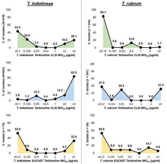 - Schirmer, H.; Henriques, C.; Simões, H.; Veríssimo, C.; Sabino, R. Prevalence of T. rubrum and T. interdigitale Exhibiting High MICs to Terbinafine in Clinical Samples Analyzed in the Portuguese Mycology Reference Laboratory. Pathogens 2025, 14, 115. [Google Scholar] [CrossRef] [PubMed]