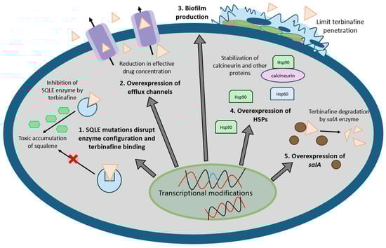 The salA gene, which encodes salicylate 1-monooxygenase in the naphthalene degradation pathway, has been proposed as a terbinafine resistance mechanism. Since terbinafine contains a naphthalene ring, it may serve as a salA substrate, leading to drug degradation [107,108,109]. The presence of terbinafine has been proposed to promote the accumulation of salA transcripts and overexpression of this gene, potentially due to a multicopy effect, potentiating resistance to terbinafine [107]. In T. rubrum isolates, challenging with cytotoxic drugs, including terbinafine, has been shown to cause overexpression of the salA gene [107,110]. Moreover, plasmids containing the salA gene were used to successfully transform a T. rubrum strain from terbinafine-sensitive to terbinafine-resistant. This suggests that a similar resistance mechanism may enable T. rubrum to counteract the inhibitory effects of terbinafine [109].