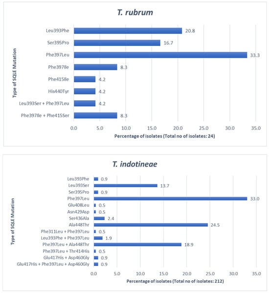 From our search, for T. rubrum isolates, Phe397Leu and Phe397Ile together comprise the most prevalent mutation (41.6% of isolates), followed by Leu393Phe (20.8%) and Ser395Pro (16.7%). Phe397Ile + Phe415Ser (8.3%) and Leu393Ser + Phe397Leu (4.2%) combination mutations are less common [29,36,37,45,51,61].