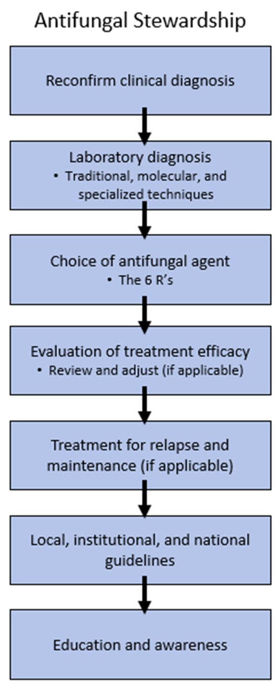 - Ray, A.; Das, A.; Panda, S. Antifungal Stewardship: What We Need to Know. Indian J. Dermatol. Venereol. Leprol. 2023, 89, 5–11. [Google Scholar] [CrossRef]