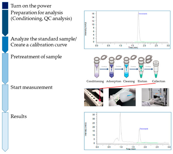 Figure 1 shows the measurement flow based on method A (HPLC-UV). The methodology for LM1010 use has been optimized and incorporated into a routine procedure. After turning on the system, only one click is needed to perform all steps of the analysis, from automatic conditioning to quality control and sample measurement, allowing optimal and precise measurements. In addition, working efficiency has been improved by setting up a specific set of consumables and general reagents required for this method (Table 1). The time required for measuring the blood concentration of VRCZ by pharmacists on the day of outpatient treatment was 0.433 (0.400–0.467) h for method A and 74.3 (71.2–94.2) h for method B (LC-MS/MS) (p < 0.001). Method A included the time required for TDM by pharmacists on the day of outpatient treatment.