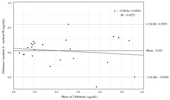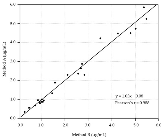The study participants were inpatients who had received treatment with VRCZ injections and oral medication in Kochi Medical School Hospital. The blood concentration of VRCZ in the participants was measured using method A and B. When multiple blood samples were collected from the same patient, all available data were included in the analysis to account for intra-individual variability. Blood concentrations were compared using Deming’s regression analysis and Bland–Altman analysis [47,48]. The regression coefficient in Deming’s regression analysis was expressed as the slope and intercept, and Pearson’s r. The limits of agreement for the error in Bland–Altman analysis were expressed as the mean value ± 1.96 × standard deviation of the difference in the measurement results for method A and B. Repeated measurements from the same patient were treated as individual data points while recognizing the potential correlation within subjects.