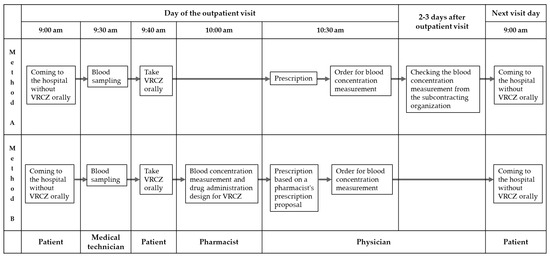 Process for measuring outpatient VRCZ blood concentrations in-hospital. Flow of TDM based on VRCZ blood concentration results in outpatients (method A vs. method B). VRCZ, voriconazole.