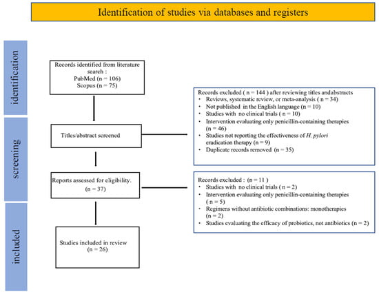 For the full-text review, 37 studies were assessed as potentially eligible. Among them, 11 articles were excluded either because they evaluated monotherapies without antibiotic combinations or did not include clinical trials. Ultimately, n = 26 full-text articles were included in the final synthesis