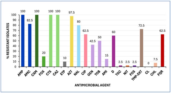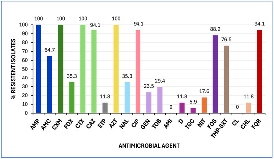 All isolates exhibited resistance to ampicillin, cefuroxime, cefotaxime, and aztreonam. Additionally, the majority (≥60%) were resistant to ceftazidime, ciprofloxacin, fosfomycin, sulfamethoxazole, and amoxicillin-clavulanic acid. Notably, two isolates (11.8%) demonstrated resistance to ertapenem (Figure 3). All isolates were classified as MDR, exhibiting resistance to at least one drug in three or more antimicrobial categories [23], and 94.1% exhibited FQR.