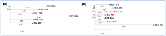 Additionally, we accessed Enterobase (https://enterobase.warwick.ac.uk/; accessed on 20 December 2024) to search for ST1193 genomes assigned to cgST140226. We identified and retrieved one publicly available genome, ESC_RA5887AA, from BioProject PRJEB21277 registered in 2020 by the University of Oxford. A subsequent SNP comparison (Figure 2B, Table S4), which included the Algerian (LREC-468), five Spanish ST1193 genomes, and ESC_RA5887AA, showed that 82.6% of nucleotide positions in the reference genome (LREC-269) were conserved across all analysed genomes. The Algerian LREC-468 genome differed by 55 SNPs from ESC_RA5887AA.