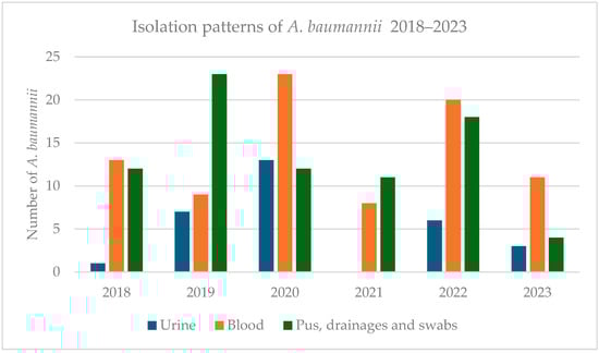 A site sampling analysis of the A. baumannii isolates showed an increase in blood culture samples from 22 to 31 [+40.9%] and urine samples from 8 to 13 [+62.5%] during the pandemic. Conversely, isolates from pus, drainage, and swabs, which are typically familiar sources for A. baumannii, decreased significantly from 35 to 23 [−34.2%] compared to the pre-pandemic period [2018–2019] (Figure 2). This reduction was likely associated with decreased hospital admissions during the lockdown period. In the post-pandemic period [2022–2023], blood cultures and urine samples positive for A. baumannii showed fluctuations but remained lower than those in the 2020 peak, while the presence in pus, drainage, and swabs slightly increased in 2022 before dropping to only four strains in 2023.