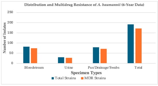Distribution and multidrug resistance of A. baumannii strains across clinical specimens over 6 years.