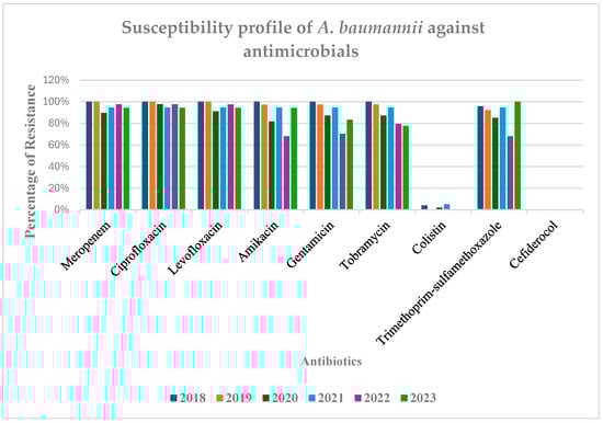 Our study found a consistently high prevalence of multidrug-resistant (MDR) A. baumannii at 89.5%. This finding highlights the bacteria’s ability to develop multiple-drug resistance [15,20]. These results are in line with previous reports, including a study from Pakistan, which noted increasing trends in A. baumannii prevalence and emphasized the necessity for regular surveillance to address the issue of drug resistance. Compared to 2020, a moderate decline in carbapenem-resistant bacteria was observed in 2022 and 2023, coinciding with the implementation of antimicrobial stewardship programs. Indeed, before this, the lack of ASP or diagnostic stewardship (DS) interventions contributed to the high and often inappropriate use of broad-spectrum antibiotics. The ASP and DS interventions adopted in 2018 include early detection supported by routine microbiological reports and the use of MALDI-TOF MS for rapid identification, as well as targeted therapy, promoted through regular audits by our multidisciplinary team, which provides feedback and recommendations on antimicrobial prescriptions. This integrated approach contributed to the observed decline in MDR isolates. Moreover, multiple studies support the idea that such stewardship can reduce the rate of antimicrobial resistance in hospital settings [21,22,23].