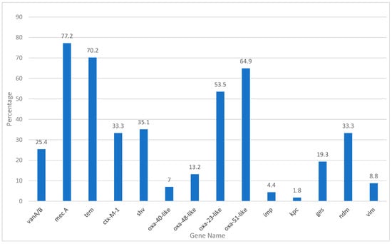 The distribution of these resistance genes demonstrated a complex and multifaceted resistance profile within the population. The high prevalence of Mec A, Tem, and shv suggests a substantial burden of β-lactam and methicillin resistance. Meanwhile, the presence of carbapenemase genes, such as Oxa-51-like, Oxa-23-like, Ndm, and Kpc, emphasizes the growing threat of multidrug-resistant, Gram-negative bacteria. Additionally, the detection of VanA/B and ges highlights the ongoing issue of glycopeptide and aminoglycoside resistance.