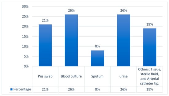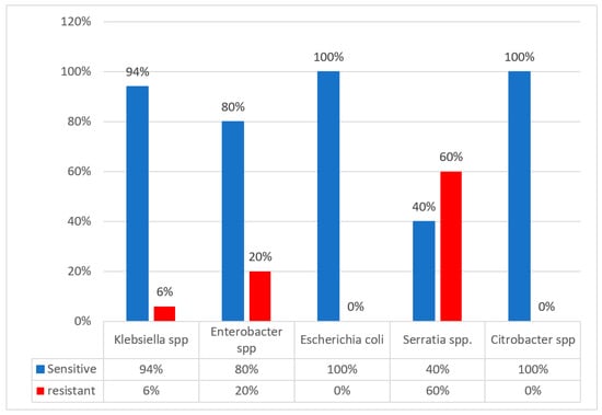In this study, the majority of the carbapenem-resistant Enterobacterales (CRE) were Klebsiella pneumoniae N = 31 (53%), followed by Enterobacter cloacae N = 9 (17%), Escherichia coli and Serratia marcescens N = 4 (8%), and Serratia fonticola, Enterobacter aerogenes, Klebsiella oxytoca, Citrobacter koseri, and Citrobacter freundii N = 1 (2%), as shown in Figure 4. A similar study in Egypt by [16] found that the carbapenem-resistant Enterobacterales were in the following proportions: K. pneumoniae (60%), E. coli (18%), P. aeruginosa (15%), and Citrobacter (7%).