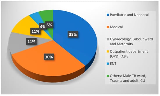 A colistin resistance of 8 μg/mL was observed in Klebsiella pnuemoniae from the neonatal ICU and Enterobacter cloacae from the female medical ward; these isolates were obtained from the Nelson Mandela Academic Hospital (NMAH). A resistance of 16 μg/mL was found in Serratia marcescens isolated from a blood culture in the neonatal wards from the NMAH and Mthatha Regional Hospital (MRH), respectively. The resistance of 16 μg/mL was found also in Serratia marcescens from a pus swab in pediatric high care at NMAH. Lastly, Enterobacter aerogenes was found in urine specimens in the female ward of NMAH. S. marcescens is an opportunistic pathogen in hospital settings. NMAH had the highest percentage of CRE infections. The prevalence of Klebsiella infections (isolates) and non-Klebsiella infections was analyzed in all hospitals included in this study; 15.1% of Klebsiella infections were recorded at NMAH, with a statistical significance of 0.01. Prevalence was measured according to the level of the healthcare facility, referral status, and the level of complicated cases in which patients have already received antibiotics from lower-level care. NMAH has the highest number of infections because it is a central provincial hospital, followed by the Mthatha Regional Hospital and district hospitals.
