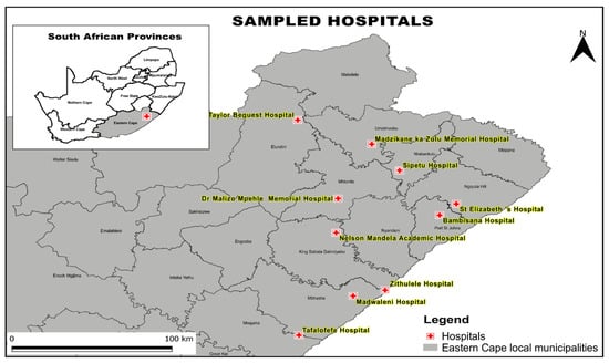 - Xayimpi, O. A map showing the location of hospitals covered by NHLS Mthatha. In QGIS; Geography Department, Walter Sisulu University: Mthatha, South Africa, 2024. [Google Scholar]