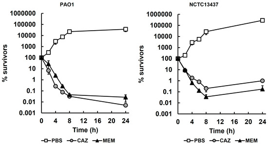 Figure 1. Time-kill assays of P. aeruginosa PAO1 and NCTC13437 exposed to meropenem and ceftazidime at 37 °C. Antibiotic concentrations were 4× MIC, apart from MEM with NCTC13437 at 1× MIC (PAO1—CAZ—4 mg/L, MEM—2 mg/L; NCTC 13437—CAZ—2500 mg/L, MEM—128 mg/L). The starting inoculum was approximately 1.0 × 107 cfu/mL. % survival following antibiotic exposure was measured at 0, 2, 4, 6, 8 and 24 h and compared with exposure to sterile PBS. The experiments were completed in triplicate and plotted as the mean with error bars representing ± standard error (SEM). MEM, meropenem; CAZ, ceftazidime.