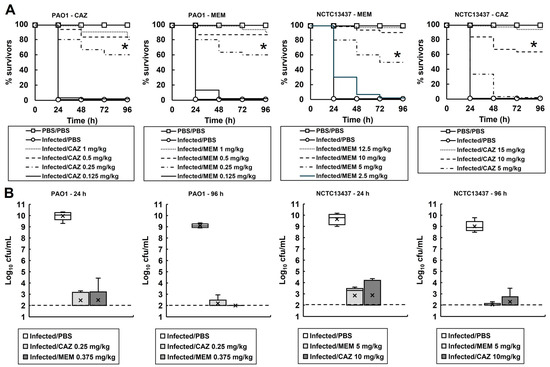 Figure 2. (A) Dose-dependent efficacy of CAZ or MEM against G. mellonella larva infected with P. aeruginosa PAO1 or NCTC13437 at 37 °C. Larvae were infected with 2.5 × 103 cfu/mL of either strain. A single dose of the antibiotic treatments was administered 2 h p.i. An uninfected control group was included, with larvae sham-infected with sterile PBS and treated with sterile PBS at 2 h p.i. The infected control group was infected with either strain of P. aeruginosa followed by treatment with sterile PBS 2 h p.i. * indicates significantly enhanced survival compared to the infected control treated with PBS (p < 0.05, log rank test); n = 30 (pooled from duplicate experiments). (B) Box plots of the internal bacterial burden of G. mellonella larvae infected with P. aeruginosa NCTC13437 or PAO1 and treated with a single dose of PBS, CAZ or MEM measured after 24 and 96 h p.i. at 37 °C. Doses of antibiotics were selected that showed significant therapeutic benefit in A. A group of 25 larvae were infected with 2.5 × 103 cfu/mL of either strain treated with a single dose of PBS, CAZ or MEM at 2 h p.i., as shown. At 24 and 96 h, five caterpillars from each experimental condition were chosen at random, and the internal burden was assessed from each. ‘X’ indicates the mean, the bar indicates the median and the error bars show the highest and lowest values within the dataset. Outlier data is shown as independent points. For each strain, the antibiotic treatment showed a significant reduction in bacterial burden compared with PBS mock treatment (p < 0.05, the Mann–Whitney U-test; n = 5). PBS—phosphate buffered saline; MEM—meropenem; CAZ—ceftazidime.