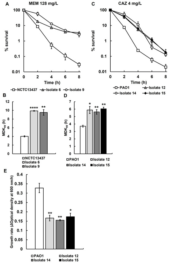 Figure 3. Time-kill assay with MEM (128 mg/L) for recovered isolates 6 and 9 from larvae infected with P. aeruginosa NCTC13437 after treatment with MEM (A), and time-kill assay with CAZ (4 mg/L) of recovered isolates 12, 14 and 15 from larvae infected with P. aeruginosa PAO1 after treatment with CAZ (C). The starting inoculum of each strain was approximately 1.0 × 107 cfu/mL. % survival of each strain following antibiotic exposure was measured at 0, 2, 4, 6 and 8 h and compared with the untreated parent strains. The experiments were completed in triplicate and plotted as the mean with error bars representing ± standard error (SEM). Minimum duration to kill (MDK99) calculated from the data presented in A and C, of recovered isolates 6 and 9 exposed to MEM (128 mg/L) (B) and recovered isolates 12, 14 and 15 exposed to CAZ (4 mg/L) (D), compared with their untreated parent strains. (E) The growth rate of recovered isolates 12, 14 and 15 was compared with their untreated parent strain P. aeruginosa PAO1. Significant difference from the untreated parental strain(s) was determined using unpaired two-tailed parametric t-tests: * p < 0.05, ** p < 0.01, and **** p < 0.0001). MEM—meropenem; CAZ—ceftazidime.