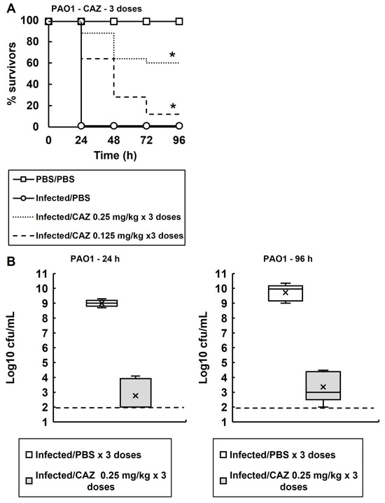 Figure 4. (A) Dose-dependent efficacy of CAZ against G. mellonella larva infected with P. aeruginosa PAO1 at 37 °C. Larvae were infected with 2.5 × 103 cfu/mL of P. aeruginosa cells. Three doses of CAZ (0.125 or 0.25 mg/kg) were administered at 2, 24 and 48 h p.i. An uninfected control group was included with larvae sham-infected with sterile PBS and treated with three doses of sterile PBS at 2, 24 and 48 h p.i. The infected control group was infected with P. aeruginosa PAO1 followed by treatment with three doses of sterile PBS. * Indicates significantly enhanced survival compared to the infected control treated with PBS (p < 0.05, log rank test); n = 30 (pooled from duplicate experiments). (B) Box plots of the internal bacterial burden of G. mellonella larvae infected with P. aeruginosa PAO1 and treated with three doses of PBS or CAZ (0.25 mg/kg) measured 24 and 96 h p.i. at 37 °C. The dose of CAZ selected showed significant therapeutic benefit in A. A group of 25 larvae were infected with 2.5 × 103 cfu/mL of P. aeruginosa PAO1 and, 2, 24 and 48 h p.i., were treated with PBS or CAZ. At 24 and 96 h, five healthy caterpillars from each experimental condition were chosen at random and the internal burden was assessed from each. ‘X’ indicates the mean, the bar indicates the median and the error bars show the highest and lowest values within the dataset. Outlier data is shown as independent points. For each strain, the antibiotic treatment showed a significant reduction in bacterial burden compared with PBS mock treatment (p < 0.05, the Mann–Whitney U-test; n = 5). PBS—phosphate buffered saline; CAZ—ceftazidime.