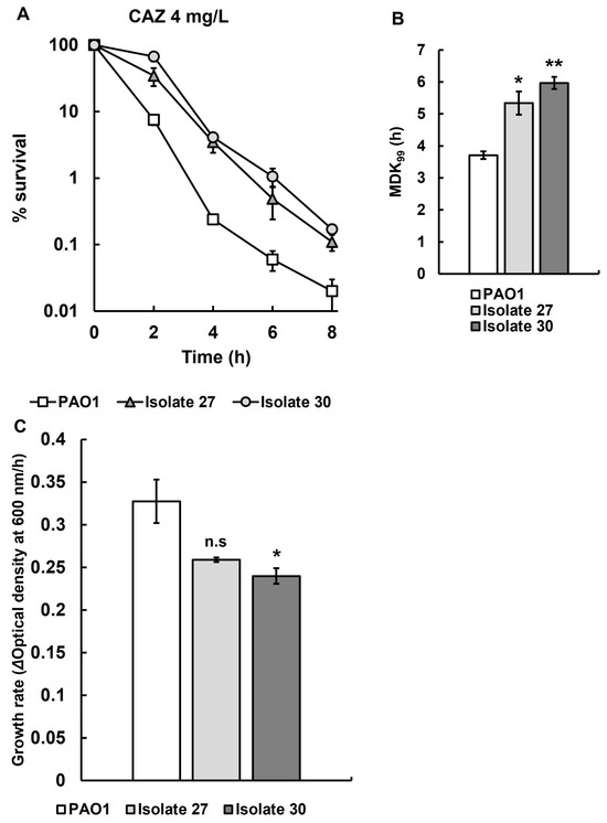 Figure 5. (A) Time-kill assay with CAZ (4 mg/L) of recovered isolates 27 and 30 from larvae infected with P. aeruginosa PAO1 after treatment with three doses of CAZ (0.25 mg/kg) 2, 24 and 48 h p.i. The starting inoculum of P. aeruginosa PAO1 was approximately 1.0 × 107 cfu/mL. % survival following antibiotic exposure was measured at 0, 2, 4, 6 and 8 h and compared with the untreated parent strain. The experiments were completed in triplicate and plotted as the mean with error bars representing ± standard error (SEM). (B) Minimum duration to kill (MDK99), calculated from the data of recovered isolates 27 and 30 exposed to CAZ (4 mg/L) presented in A, compared with the untreated parent strain. (C) The growth rates of recovered isolates 27 and 30 were compared with their untreated parent strain P. aeruginosa PAO1. Significant difference to the untreated parental strain(s) was determined using unpaired two-tailed parametric t-tests: * p < 0.05, ** p < 0.01). n.s—no significant difference; CAZ—ceftazidime.