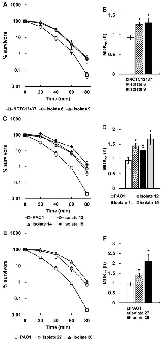 Figure 6. Time-kill (A,C,E) and minimum duration to kill (MDK99) (B,D,F) assays at 50 °C of P. aeruginosa recovered isolates from infected larvae treated with a single dose of MEM (isolates 6 and 9; (A,B)) or CAZ (isolates 12, 14 and 15; (C,D)), or three doses of CAZ (isolates 27 and 30; (E,F)), compared with untreated parental P. aeruginosa PAO1 or NCTC13437. The starting inoculum of each P. aeruginosa strain was approximately 1.0 × 107 cfu/mL. % survival of the recovered isolates was measured after 0, 20, 40, 60 and 80 min exposure at 50 °C and compared with the respective untreated parent strains. The experiments were completed in triplicate and plotted as the mean with error bars representing ± standard error (SEM). The MDK99 at 50 °C was calculated from the data presented in the time-kill curves and compared with their respective untreated parent strains. Significant differences in the MDK99 to the untreated parental strain(s) was determined using non-linear parametric t-tests: * p < 0.05.